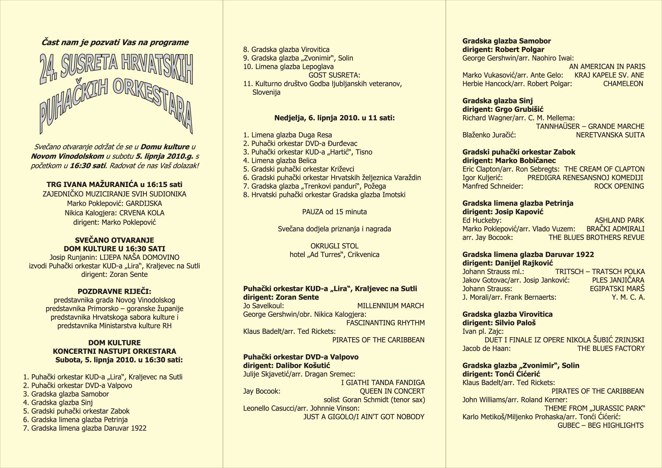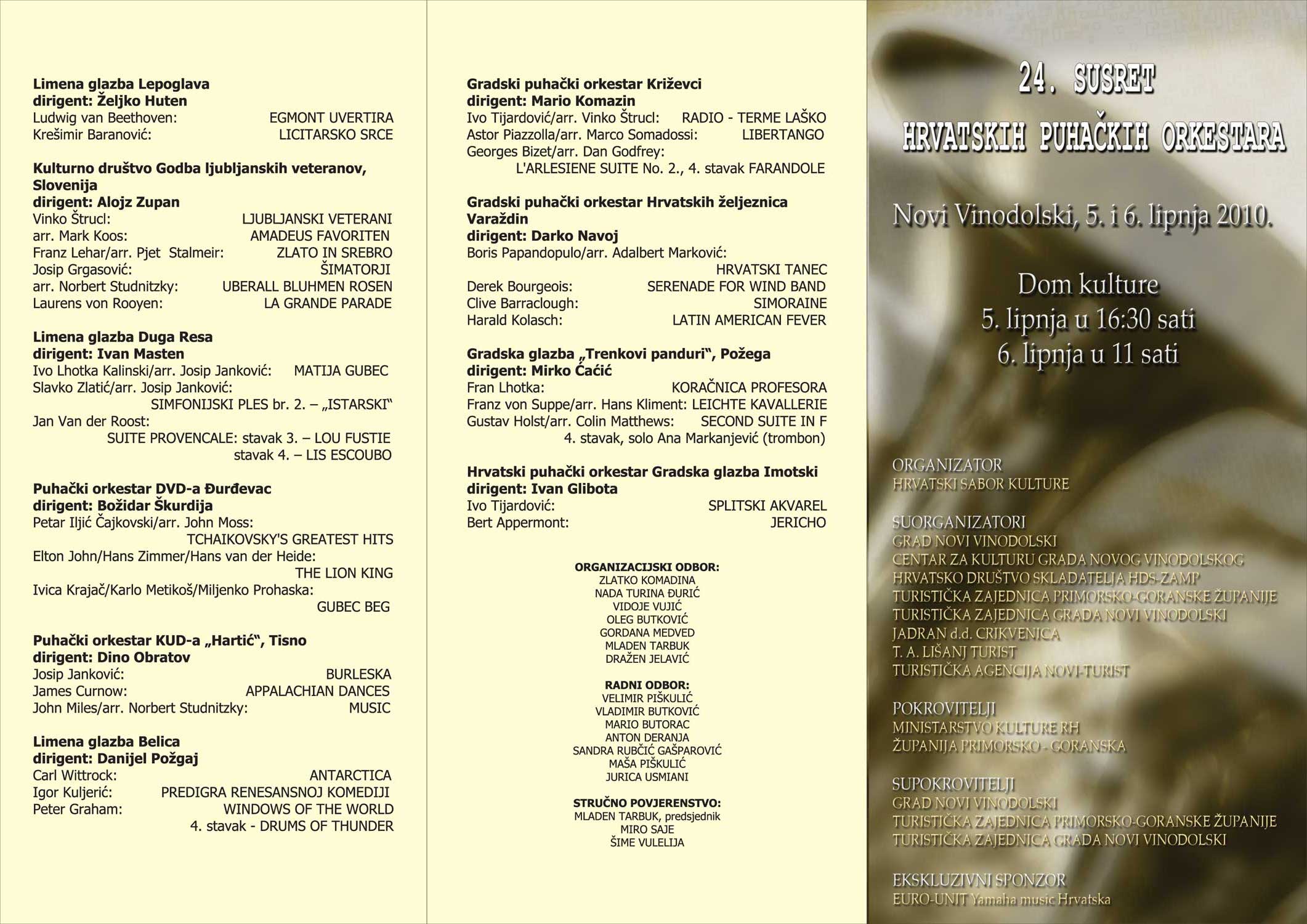 U organizaciji Hrvatskog sabora kulture, a pod pokroviteljstvom Ministarstva kulture Republike Hrvatske i Županije Primorsko-goranske, u Novom Vinodolskom 5. i 6. lipnja 2010. godine održao se 24. Susret hrvatskih puhačkih orkestara.