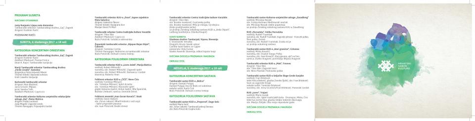 - u kategoriji koncertnih orkestara, Prvu nagradu Starijem Tamburaškom orkestru Tamburaškog društva „Ferdo Livadić“ iz Samobora, Drugu nagradu Tamburaškom orkestru Centra tradicijske kulture Varaždin te Treću nagradu Županijskom tamburaškom orkestru „Stjepan Bujan Stipić“ Čakovec, dok je Nagradu za najbolju izvedbu djela u nakladi Hrvatskog sabora kulture osvojio Tamburaški orkestar KUU-a „Zvon“, župne zajednice Mala Subotica za izvedbu skladbe „Pri Muri“ autora Marijana Sivoša, a pod ravnanjem Valentina Škvorca;