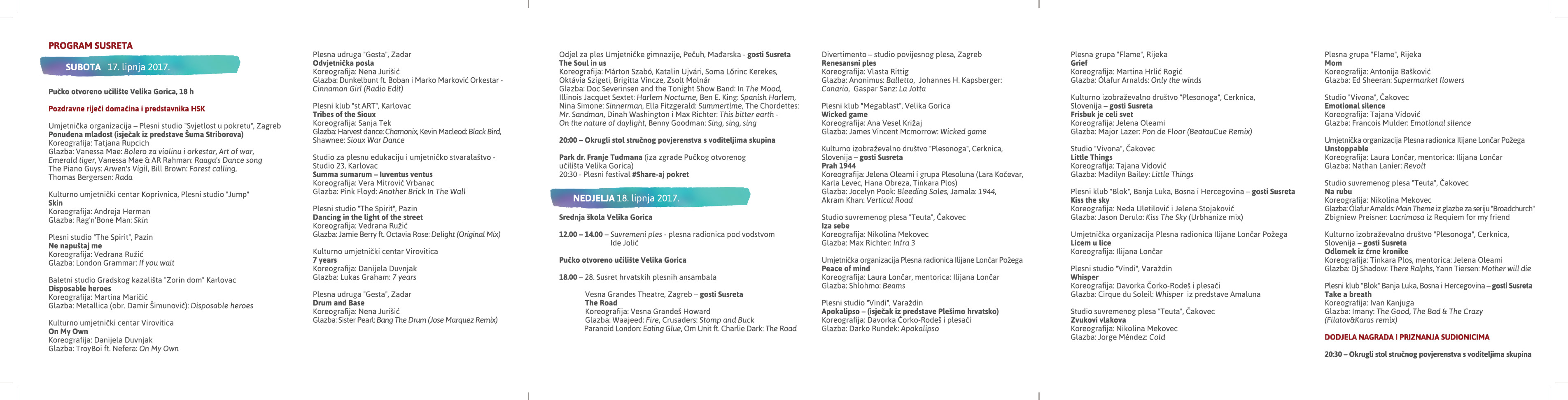 Susret se održava u okviru poznate manifestacije Velikogoričke večeri, a suorganizatori su Plesni klub Megablast i Pučko otvoreno učilište Velika Gorica. Na Susretu će tijekom dva dana nastupiti 250 plesača s 31 koreografijom. Po prvi puta ove godine u goste nam stiže Vesna Grandes Theatre iz Zagreba, Odjel za ples Umjetničke gimnazije iz Pečuha te Plesni klub "Blok" iz Banja Luke. Slovenski plesni amaterizam predstavit će Kulturno prosvjetno društvo "Plesonoga" iz Cerknice. Po završenom programu u dvorani i okruglom stolu pozivamo vas da nam se pridružite u Parku dr. Franje Tuđmana i podržite prvi izdanje plesnog festivala #Share - aj pokret u organizaciji Plesnog kluba Megablast. U nedjelju 18.6. nastavljamo s plesnom radionicom za sve sudionike pod vodstvom članice stručnog povjerenstva i slobodne plesne umjetnice Ide Jolić. Po održanim koncertima, tročlano stručno povjerenstvo u sastavu Jasminka Petek Krapljan, Ida Jolić i Tihomir Kološić održat će okrugle stolove sa sudionicima i dodijeliti Nagrade Hrvatskog sabora kulture za najbolju koreografiju, izvedbu i kostim. Najuspješnija plesna skupina osvaja i poklon bon Obrta za proizvodnju "Svjetlost u krpici", vl. Milene Jurmić iz Zagreba za izradu jednog kostima po izboru u protuvrijednosti od 500,00 kn.