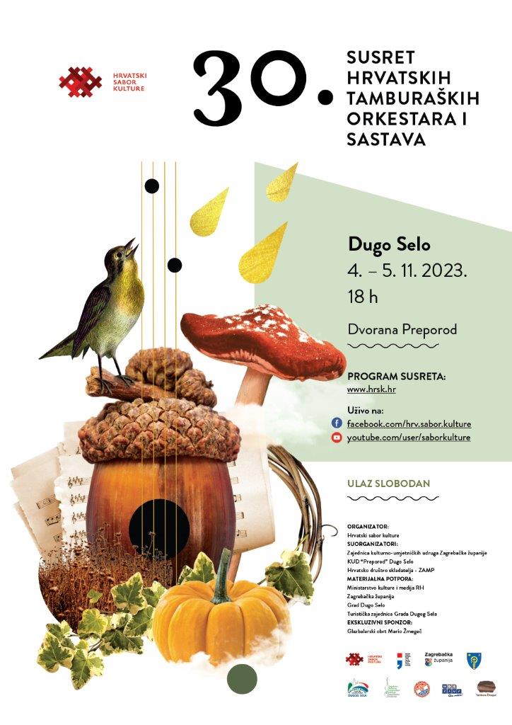 U organizaciji Hrvatskog sabora kulture i suorganizaciji Zajednice kulturno umjetničkih udruga Zagrebačke županije, KUD-a „Preporod“ Dugo Selo i HDS ZAMP-a, u Dvorani „Preporod“ u Dugom Selu 4. i 5. studenoga 2023. održan je jubilarni 30. Susret hrvatskih tamburaških orkestara i sastava.