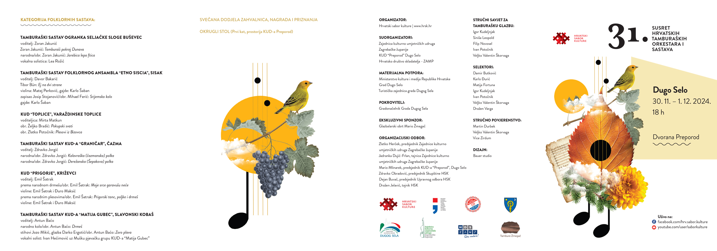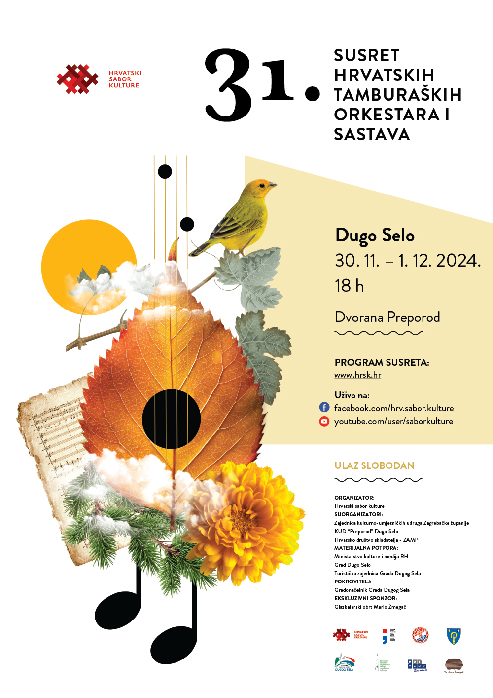 U organizaciji Hrvatskog sabora kulture i suorganizaciji Zajednice kulturno umjetničkih udruga Zagrebačke županije, KUD-a „Preporod“ Dugo Selo i HDS ZAMP-a, u Dvorani „Preporod“ u Dugom Selu, 30. studenoga i 1. prosinca 2024. održan je 31. Susret hrvatskih tamburaških orkestara i sastava.