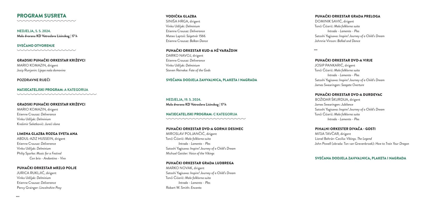 Natjecateljski program Susreta će započeti svečanim otvorenjem u nedjelju, 5. svibnja u Maloj dvorani KD Vatroslava Lisinskog, gdje će u 17 sati nastupiti najbolji puhački orkestri A kategorije natjecanja. Drugi dio programa održat će se u nedjelju, 19. svibnja u KD Lisinski s početkom u 17 sati s orkestrima sudionicima C kategorije.