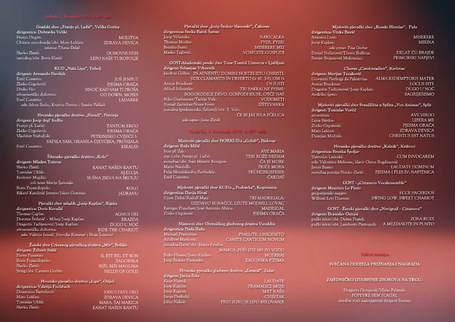 U nedjelju 3. listopada s početkom u 10 i 30 sati uslijedili su nastupi zborova po sljedećem redoslijedu: Mješoviti pjevački zbor HORKUD-a „Golub“ Bjelovar, Mješoviti pjevački zbor KUD-a „Podravka“ Koprivnica, Mješoviti zbor Obrtničkog glazbenog društva Varaždin, Hrvatsko pjevačko društvo „Zoranić“ Zadar, Mješoviti pjevački zbor „Rondo Histriae“ Pula, Chorus „Carolostadien“ Karlovac, Mješoviti pjevački zbor Sveučilišta u Splitu „Vox Animae“ Split te Hrvatsko pjevačko društvo „Kalnik“ Križevci. Na kraju nedjeljnog programa nastupili su kao gosti „Cittanova Vocalensemble“ te Ženski pjevački zbor „Novigrad – Cittanova“.