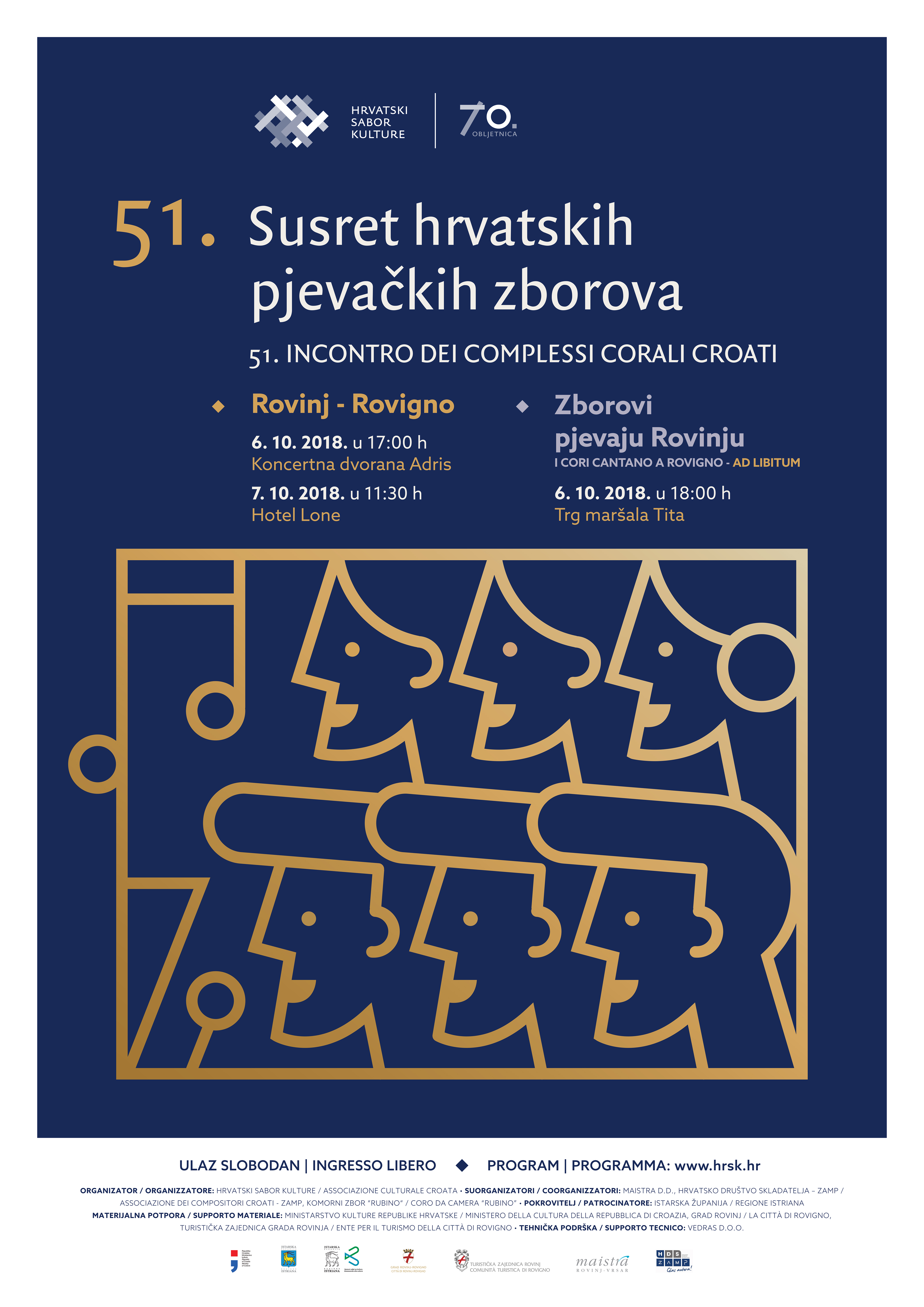 51. Susret hrvatskih pjevačkih zborova koji će biti održan u gradu Rovinju dana 6. i 7. listopada 2018. godine pod pokroviteljstvom Istarske županije uz materijalnu potporu Ministarstva kulture RH jedna je od 10 nacionalnih manifestacija koje na godišnjoj razini organizira Hrvatski sabor kulture.