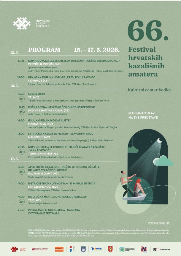 U Vodicama će se i ove godine okupiti najbolje od hrvatskog kazališnog amaterizma. U organizaciji Hrvatskog sabora kulture i Centra za umjetnost i kulturu, 66. Festival hrvatskih kazališnih amatera održat će se u dva svibanjska vikenda – od 8. do 10. svibnja te od 15. do 17. svibnja 2026. godine.