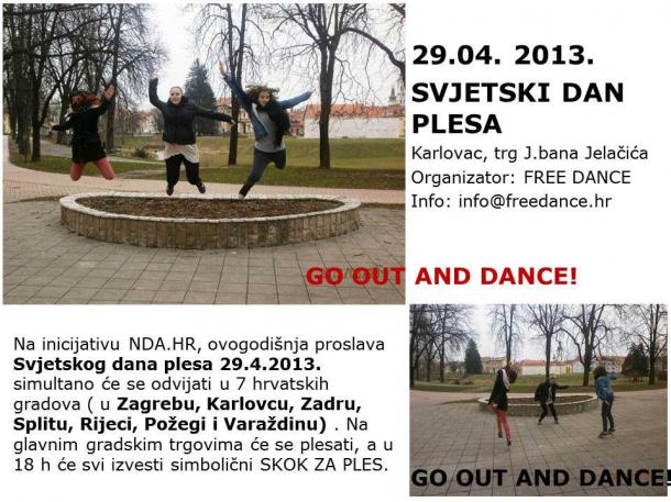 Na inicijativu NDA.HR, ovogodišnja proslava Svjetskog dana plesa 29.4.2013. simultano će se odvijati u 7 hrvatskih gradova (u Zagrebu, Karlovcu, Zadru, Splitu, Rijeci, Požegi i Varaždinu). Na glavnim gradskim trgovima će se plesati, a u 18 h će svi izvesti simbolični SKOK ZA PLES.