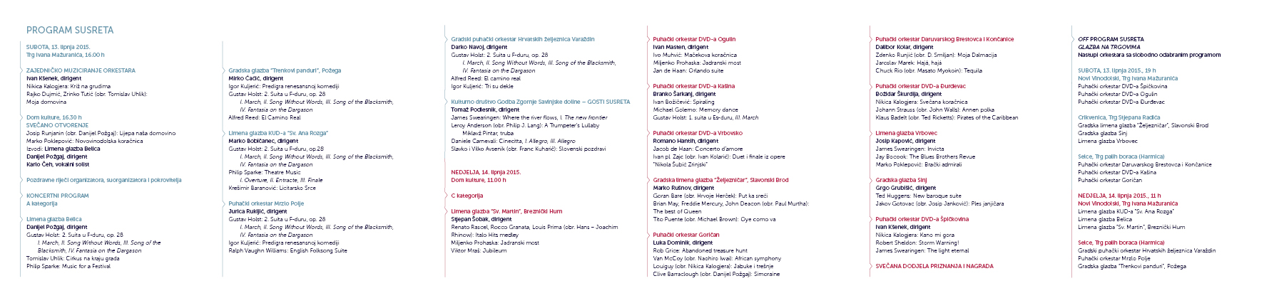 Prvog dana Susreta, 13. lipnja predstavilo se 5 najboljih hrvatskih puhačkih orkestara A kategorije koncertnog programa koji dolaze iz Belice, Požege, Dubravice, Mrzlog Polja i Varaždina i gosti iz Slovenije - Kulturno društvo Godba Zgornje Savinjske doline dok je u nedjeljnom programu, 14. lipnja nastupilo 11 orkestara unutar C kategorije koncertnog programa koji dolaze iz Brezničkog Huma, Ogulina, Kašine, Vrbovskog, Slavonskog Broda, Goričana, Daruvarskog Brestovca i Končanice, Đurđevca, Vrbovca, Sinja i Špičkovine.