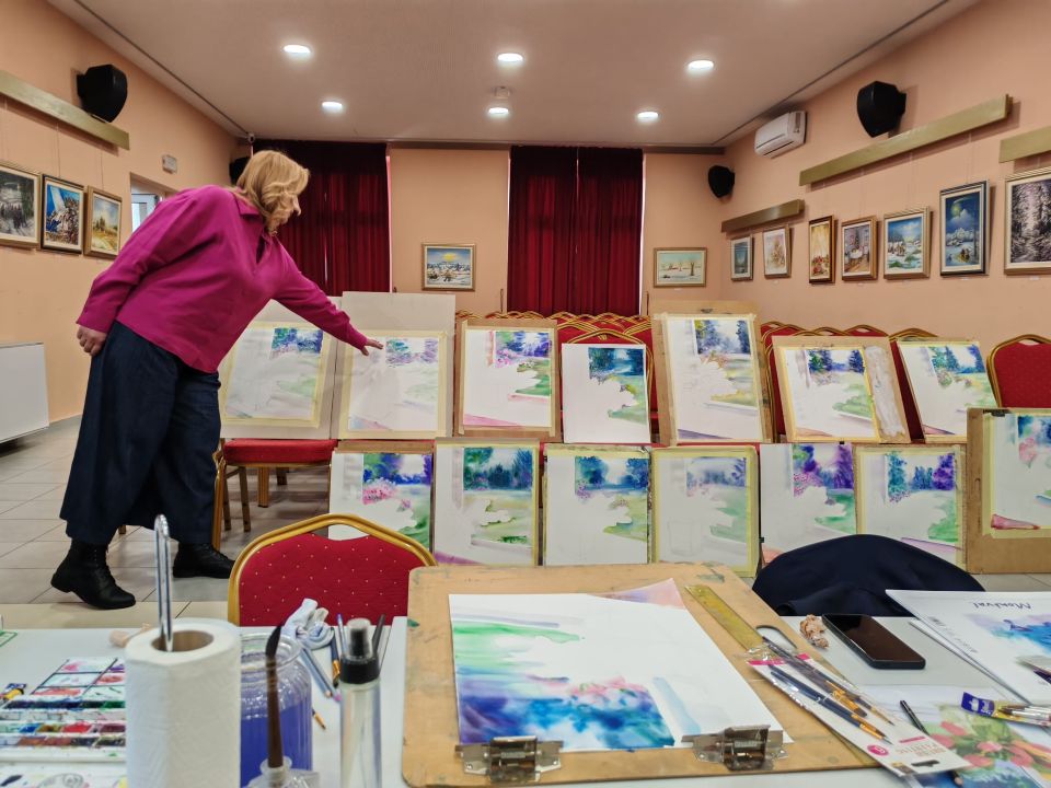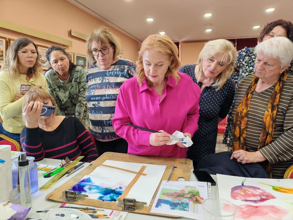 Program radionice bio je osmišljen kao kombinacija teorijskog i praktičnog rada, pri čemu su se sudionici upoznali s osnovnim principima akvarelne tehnike. Poseban naglasak stavljen je na razumijevanje transparentnosti boje, postupno građenje tonova, odnos vode i pigmenta te razvoj osjećaja za mekoću, fluidnost i spontanost izraza – ključne karakteristike akvarela kao slikarske discipline.