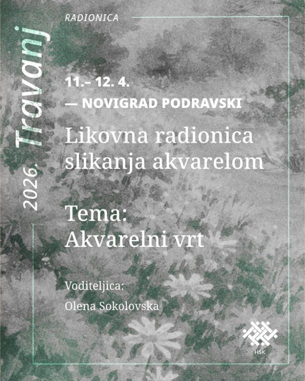 Hrvatski sabor kulture poziva Vas na likovnu radionicu „AKVARELNI VRT“ koja će biti održana 11. i 12. travnja 2026. pod vodstvom akademske slikarice Olene Sokolovske. Radionica će se održati u Novigradu Podravskom u Dvorani ZKF (Ze Ka eF) (Trg dr. Franje Tuđmana 4, 48325 Novigrad Podravski), u suorganizaciji sa Zajednicom kulturno-umjetničkih udruga Koprivničko-križevačke županije.