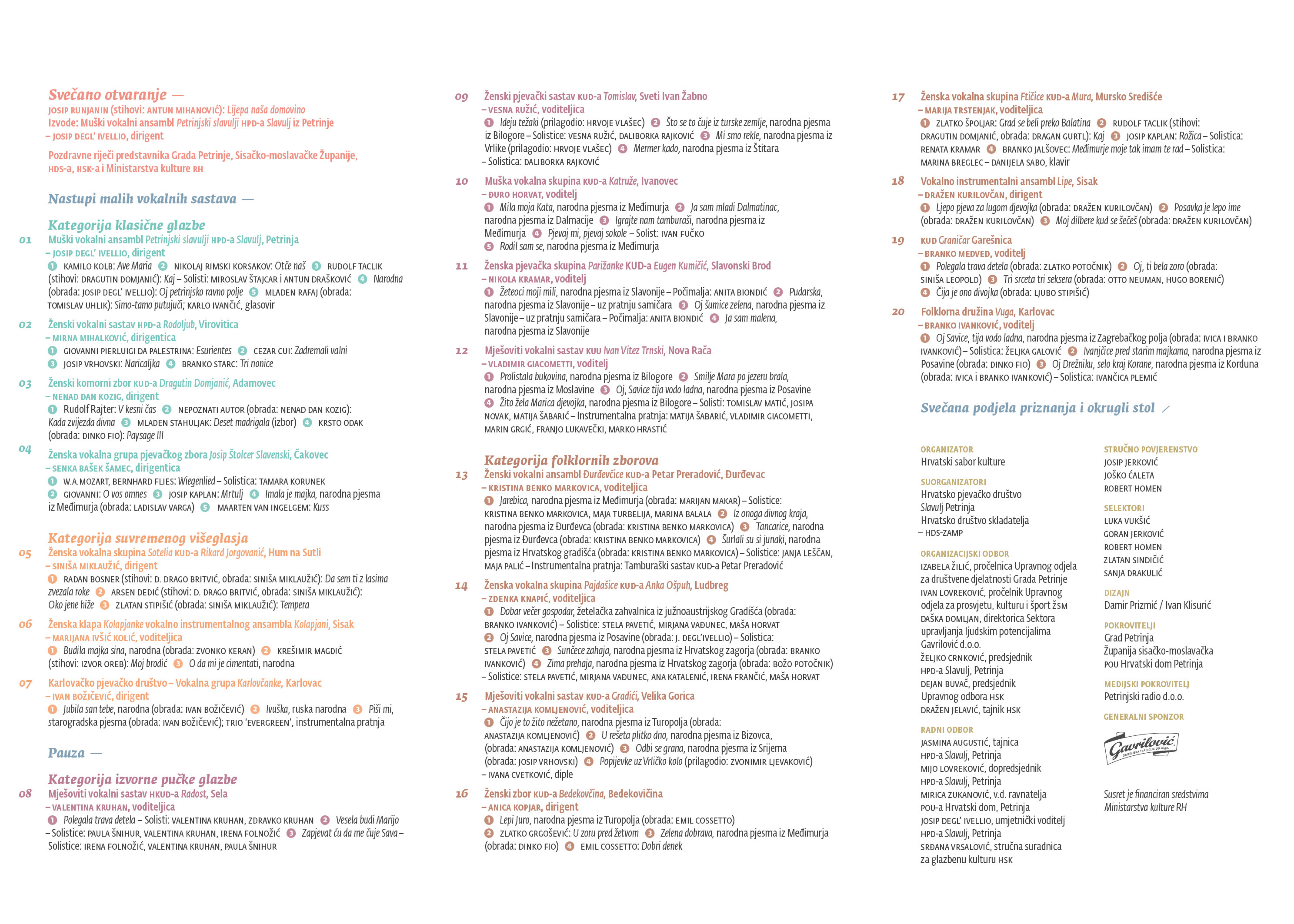 Ovogodišnji Susret svečano otvarili su domaćini i glavni suorganizatori Muški vokalni ansambl „Petrinjski slavulji“ HPD-a „Slavulj" iz Petrinje pod ravnanjem Josipa degl'Ivellia nakon čega je uslijedio nastup svih ansambala po kategorijama klasične glazbe, suvremenog višeglasja, izvorne pučke glazbe i folklornih zborova.