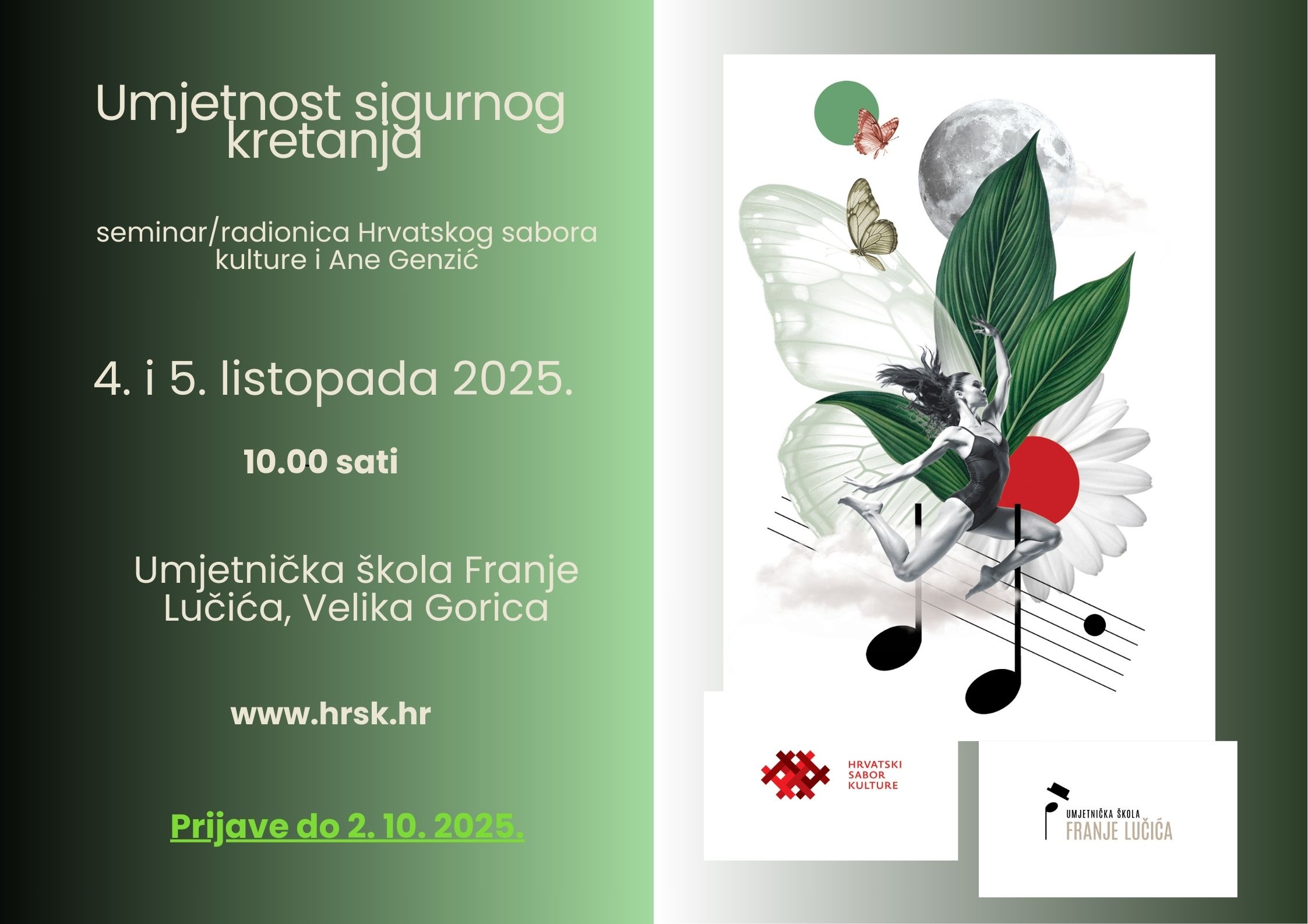 Hrvatski sabor kulture vas poziva na sudjelovanje na seminaru/radionicu „Umjetnost sigurnog kretanja – metodika, praksa i inspiracija u poučavanju plesa“ koji će se 4. - 5. 10. 2025. održati u Velikoj Gorici u Umjetničkoj školi Franje Lučića, Slavka Kolara 39, 10410 Velika Gorica, s početkom u 10 sati. Dolazak je moguć od 9.30 sati.