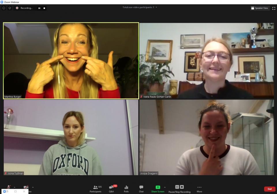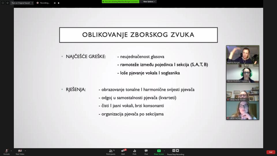 Online seminar Martina Burger je putem ZOOM-a vodila iz Ljubljane, uz moderiranje i hosting webinara od strane Srđane Vrsalović, stručne suradnice za glazbenu kulturu HSK-a iz ureda HSK-au Zagrebu. Četverodnevni seminar obuhvatio je predavanja voditeljice, video snimke i online prezentaciju vokalnih vježbi, samostalan i zajednički rad polaznika i voditeljice uz savjete za usavršavanje vokalne tehnike te individualne konzultacije.