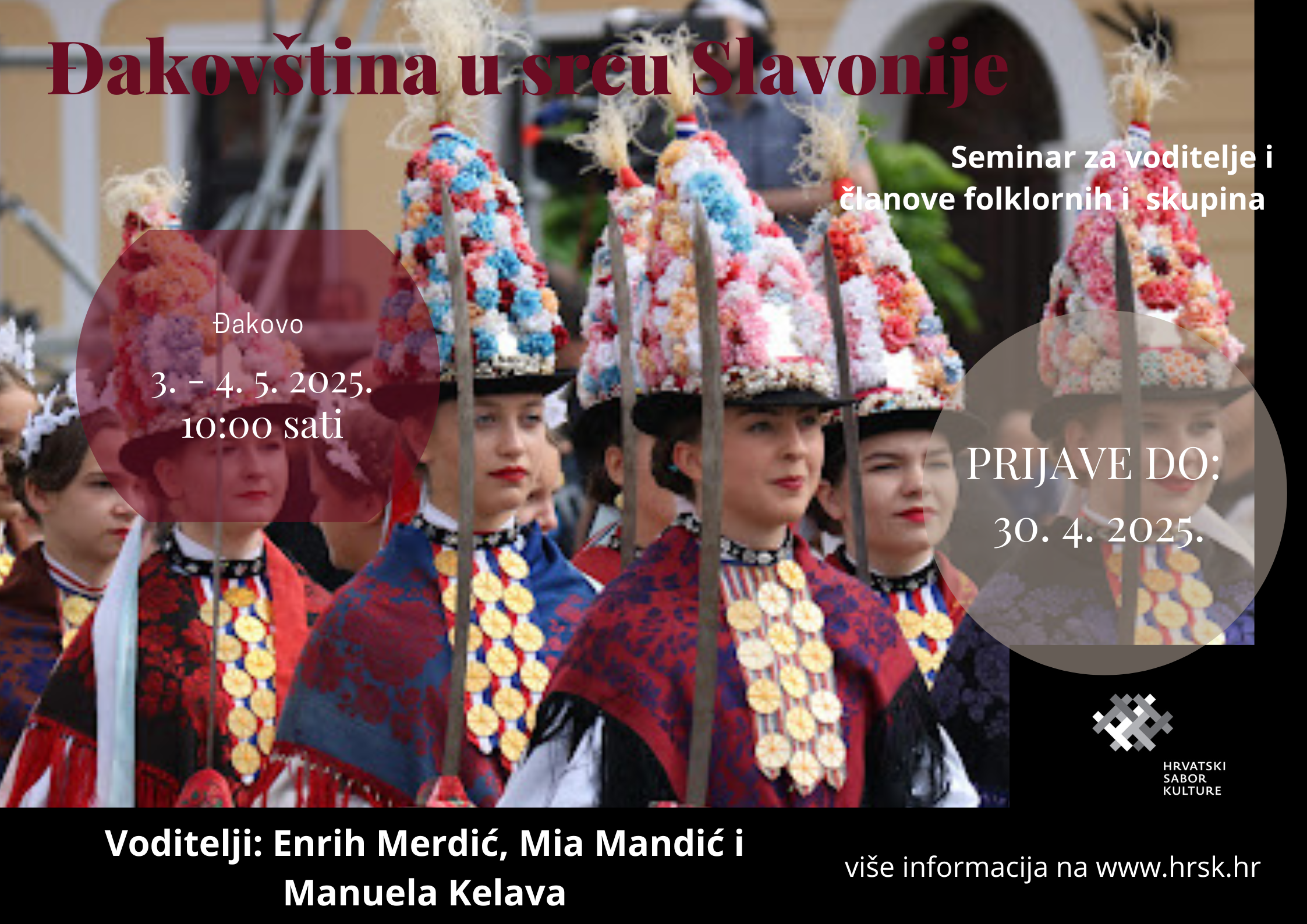 Prema prihvaćenom Planu i programu za 2025. HSK je u suradnji sa KUD-om „Tena“ Đakovo organizirao Seminar za voditelje folklornih skupina na temu glazbenih i plesnih tradicija Đakovštine u prigodi obilježavanja 40. obljetnice rada KUD-a „Tena“ i Međunarodnog dana plesa. Seminar je uspješno održan 3. i 4. 5. 2025. pod vodstvom Enriha Merdića, a uz predavanja Manuele Kelava i Mije Mandić. Okupio je 26 polaznika iz Donjeg Miholjca, Viljeva, Čađavice, Novog Čiča, Čačinaca i Đakova. U programu su aktivno sudjelovali i plesači i svirači KUD-a Tena kao pokazni ansambl. Nakon predstavljanja plesne, glazbene i tradicije odijevanja Đakovštine raspravljalo se i o nematerijalnoj kulturnoj baštini na primjeru Ljelja iz Gorjana te o važnosti Đakovačkih vezova u prezentaciji i očuvanju tradicijske baštine.
